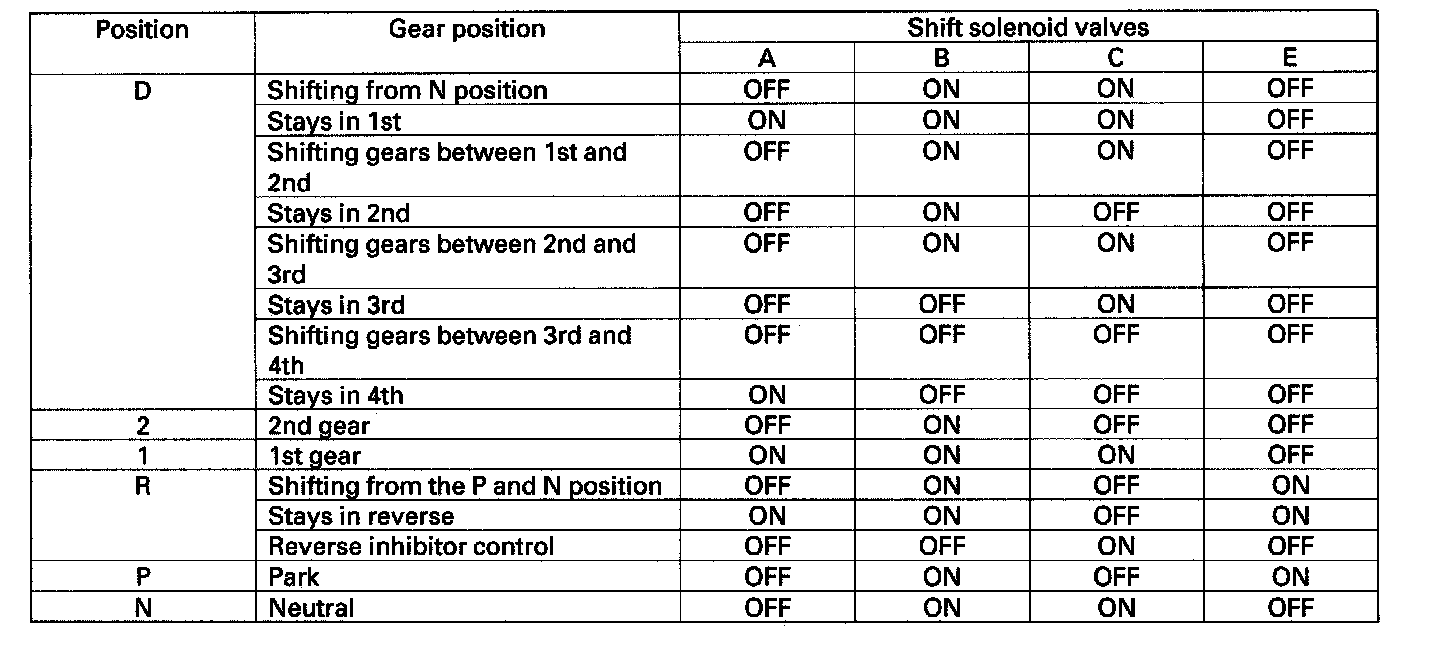 The PCM turns the shift solenoid valves A, B, C, and E ON and OFF to control shifting of the transmission. The combination of driving signals to shift solenoid valves A, B, C, and E are shown in table.