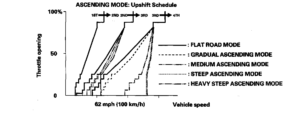 When the PCM determines that the vehicle is climbing a hill in the D position, the system extends the engagement area of 2nd and 3rd gears to prevent the transmission from frequently shifting between 2nd and 3rd gears, and between 3rd and 4th gears, so the vehicle can run smooth and have more power when needed.