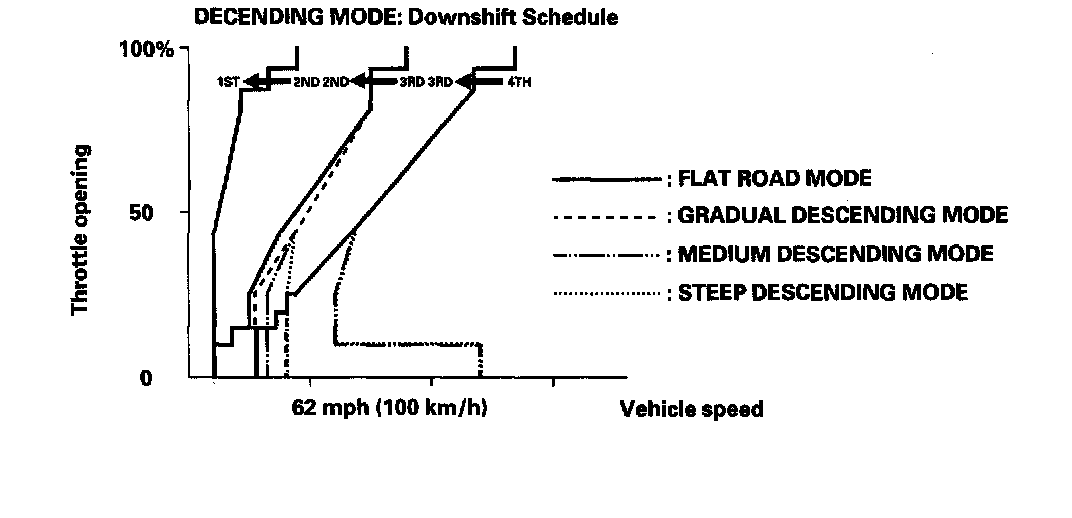 When the PCM determines that the vehicle is going down a hill in the D position, the shift-up speed from 3rd to 4th gear, and from 2nd to 3rd gear (when the throttle is closed) becomes higher than the speed for flat road driving to widen the 3rd gear and 2nd gear driving area. This, in combination with engine braking from the deceleration lock-up, achieves smooth driving when the vehicle is descending. There are three descending modes with different 3rd gear driving areas and 2nd gear driving areas according to the magnitude of a gradient stored in the PCM. When the vehicle is in 4th gear, decelerating, and when you are applying the brakes on a steep hill, the transmission will downshift to a lower gear. When you accelerate, the transmission will then return to a higher gear.
