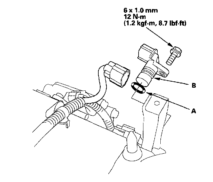 3. Install the new O-ring (A) on the mainshaft speed sensor, and install the input shaft (mainshaft) speed sensor (B) in the transmission housing.