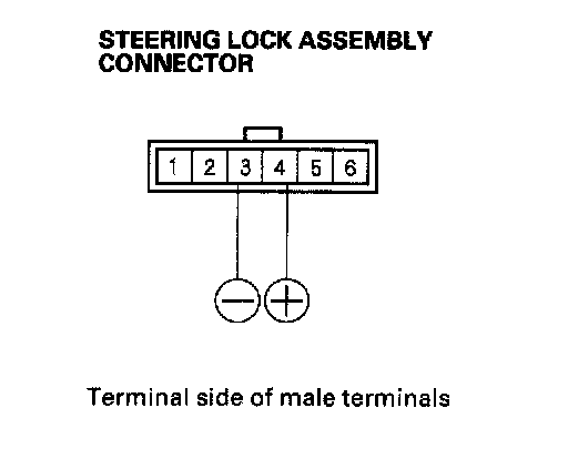 4. Connect the battery positive terminal to steering lock assembly connector terminal No. 4, and connect the battery negative terminal to No. 3 terminal. Make sure that the ignition key cannot be turned to LOCK (0) position. Release the battery terminals, and make sure that the key can be turned to LOCK (0) position and removed from the cylinder.