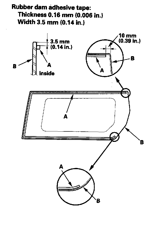 10. Attach the rubber dam (A) with adhesive tape to the inside surface of the glass (B) as shown. Be careful not to touch the glass where adhesive will be applied.