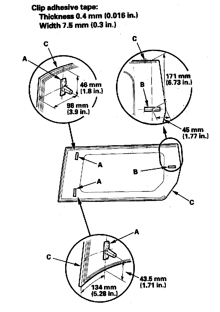 11. Before installing the clips (A, B), apply primer to the inside face of the quarter glass (C) where clips will be installed, and apply the clips with adhesive tape. Be careful not to touch the quarter glass where adhesive will be applied.