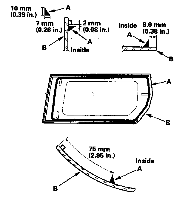15. Put the cartridge in a caulking gun, and run a bead of adhesive (A) around the edge of the glass (B) as shown. Apply the adhesive within 30 minutes after applying the glass primer. Make a slightly thicker bead at each corner.