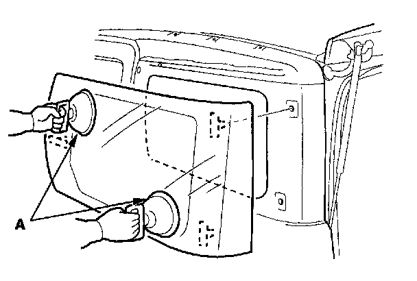 16. Use suction cups (A) to hold the quarter glass over the opening, align it and set it down on the adhesive. Lightly push on the quarter glass until its edges are fully seated on the adhesive all the way around. Do not open or close the doors until the adhesive is dry.