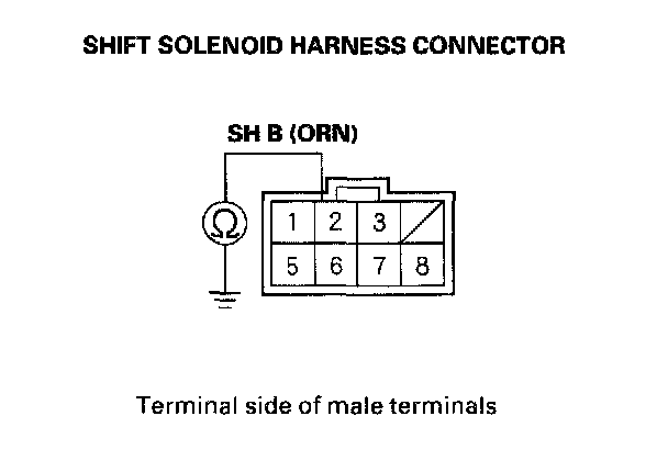 12. Measure the resistance between shift solenoid harness connector terminal No. 2 and body ground.