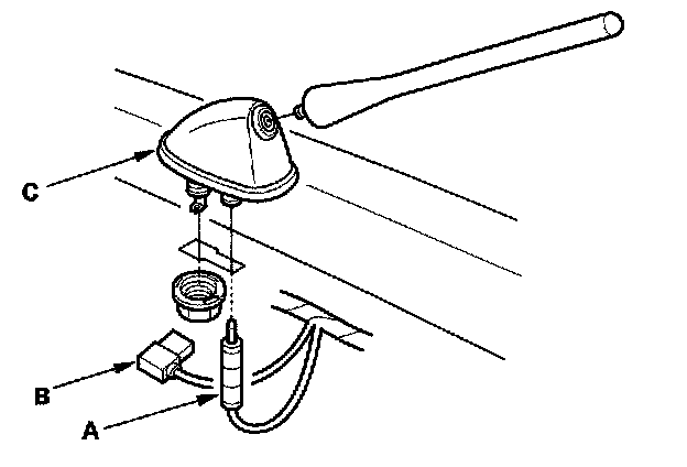 Disconnect the antenna lead connector (A) and 1P connector (B) from the roof antenna (C).