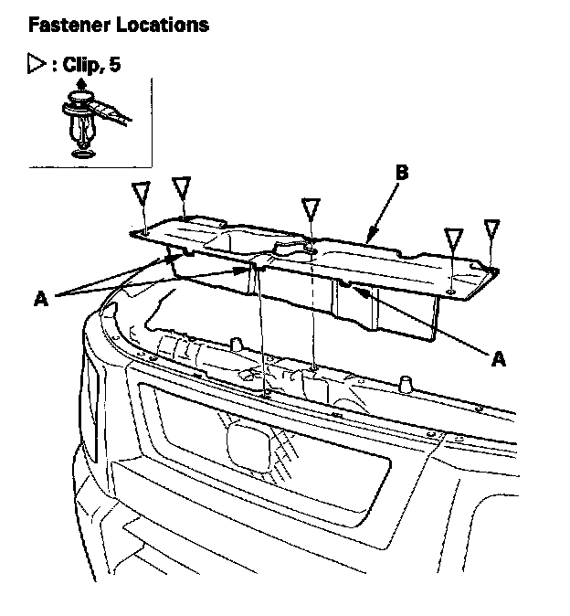 1. Remove the clips, and release the hooks (A), then remove the front grille cover (B). Take care not to scratch the front bumper.