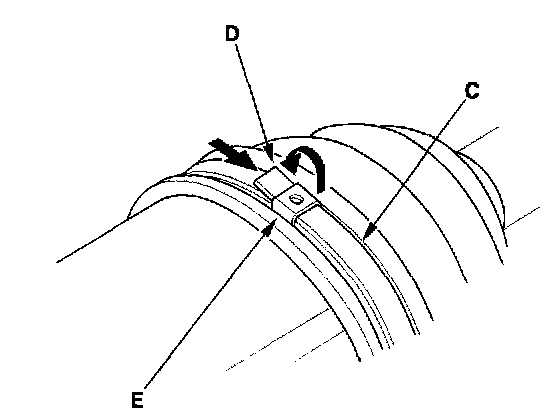^ If the boot band is a double loop type (C), lift up the band bend (D), and push it into the clip (E).