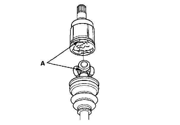 ^ Reinstall the inboard joint onto the driveshaft by aligning the marks (A) on the inboard joint and the rollers.