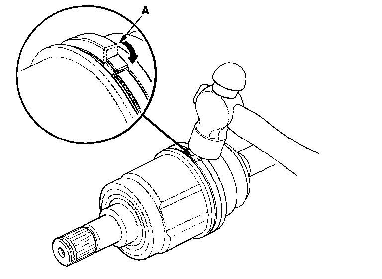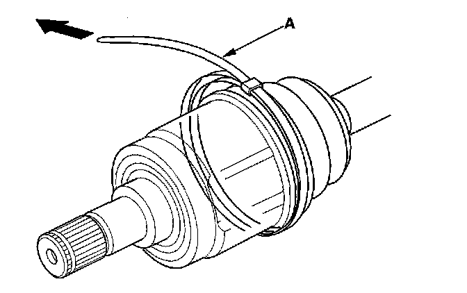 9. Fit the boot ends onto the driveshaft and the inboard joint, then install the new double loop band (A) onto the boot.