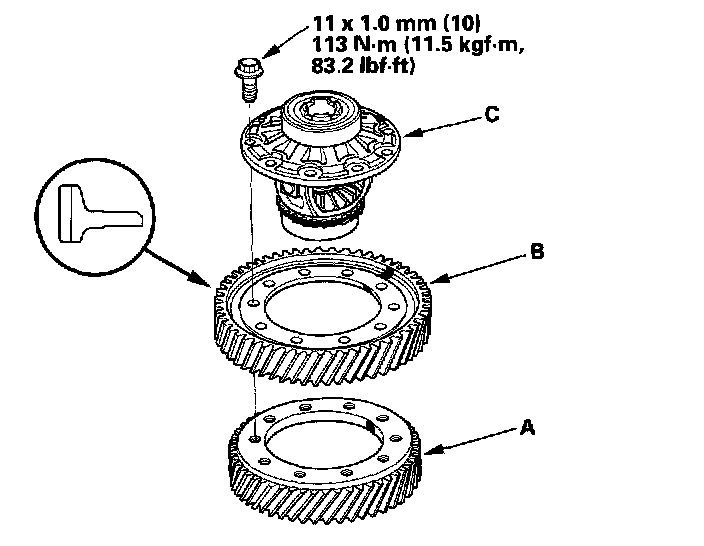 Differential Carrier, Final Driven Gear, Transfer Drive Gear Replacement1. Remove the bolts (left-hand threads) in a crisscross pattern in several steps, then remove the driven near (A) from the differential carrier (B).