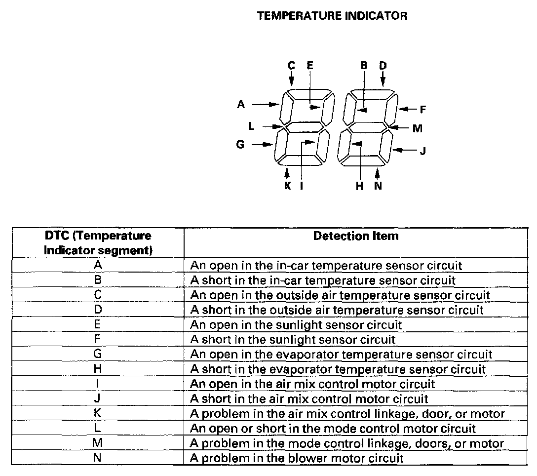 To retrieve the DTC, you must run the self-diagnosis function. In the case of multiple problems, the respective indicator segments will come on. If indicator segments A, C, E, G, I, and L come on at the same time, there may be an open in the common ground wire of the sensors.