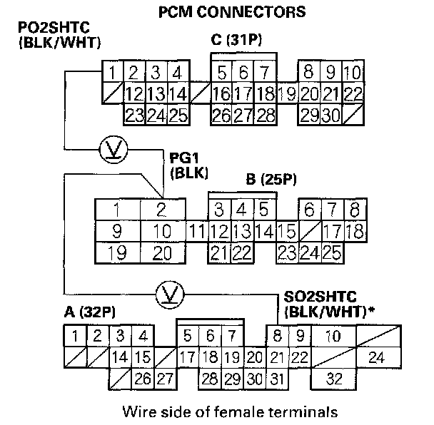 17. Measure voltage between PCM connector terminal C1 (A8) * and B2.