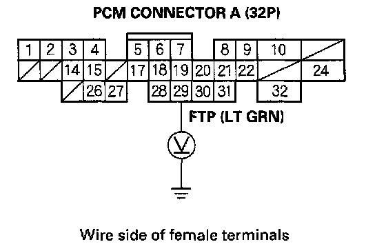 5. Monitor the FTP sensor voltage with the Honda PGM Tester, or measure voltage between body ground and PCM connector terminal A29.