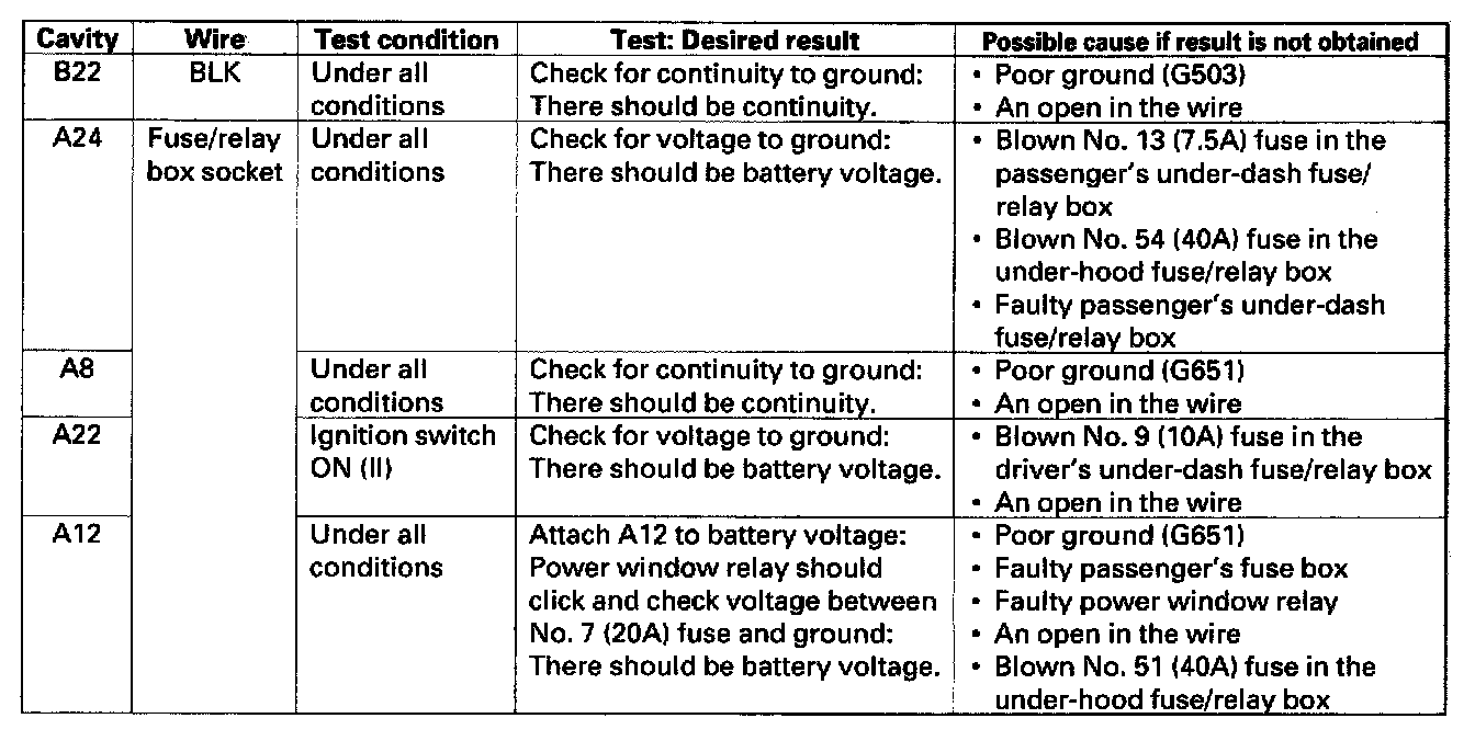 3. Make the given input tests at the 22P connector B and the passenger's under-dash fuse/relay box socket connector A. Be careful not to spread the fuse box connectors.