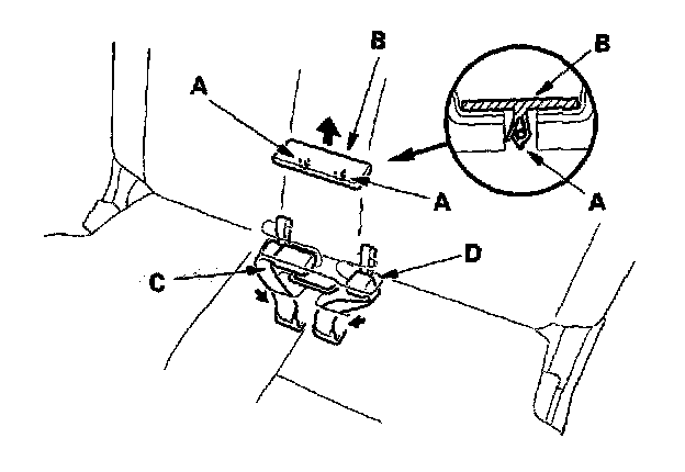 3. On the left third row seat: Release the hooks (A), then remove the seat belt buckle pocket (B), and tuck the left third row seat belt buckle (C) and center third row seat belt detachable anchor (D) under the seat cushion.