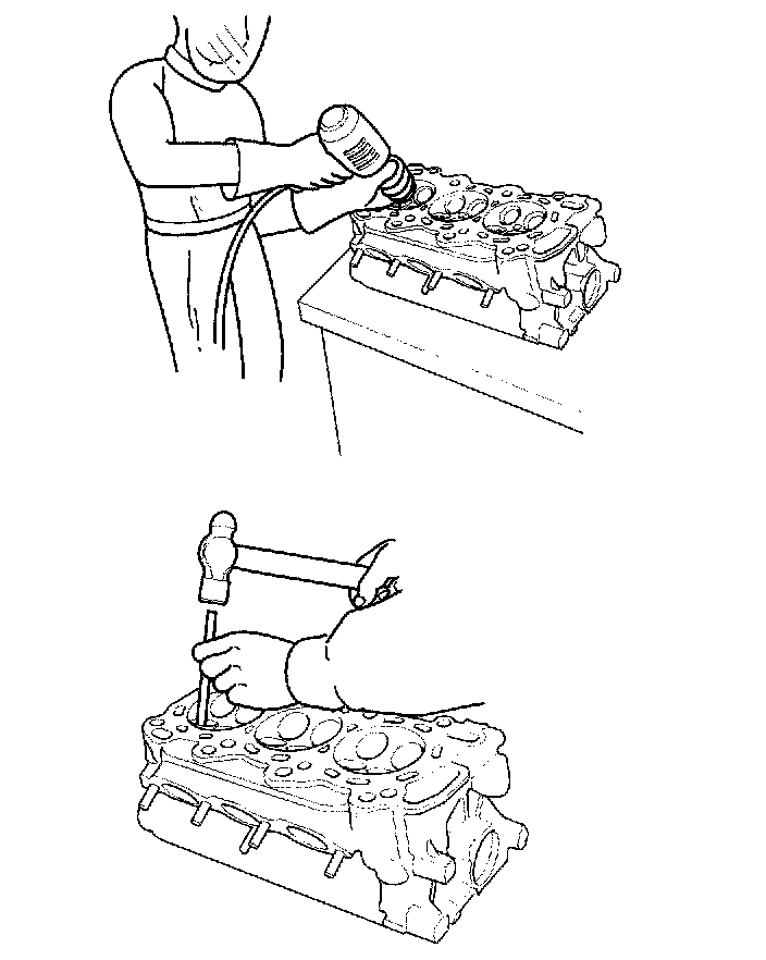 5. Working from the camshaft side, use the driver and an air hammer to drive the guide about 2 mm (0.1 inch) towards the combustion chamber. This will knock off some of the carbon and make removal easier. Hold the air hammer directly in line with the valve guide to prevent damaging the driver. Wear safety goggles or a face shield.