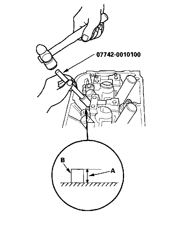 9. Apply a thin coat of clean engine oil to the outside of the new valve guide. Install the guide from the camshaft side of the head; use the special tool to drive the guide in to the specified installed height (A) of the guide (B). If you have all 12 guides to do, you may have to reheat the head.