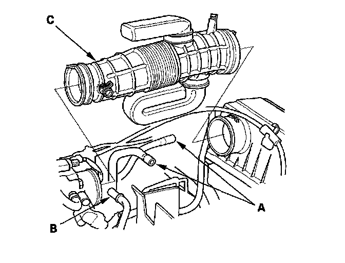 2. Remove the vacuum hoses (A) and breather pipe (B), then remove the intake air duct (C).