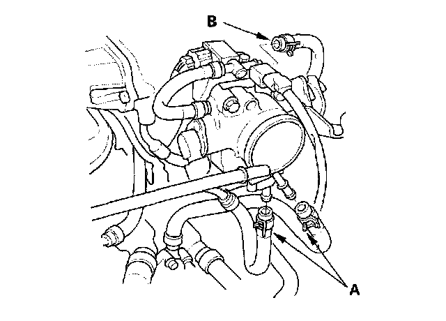 4. Install the water bypass hoses (A) and EVAP canister hose (B).