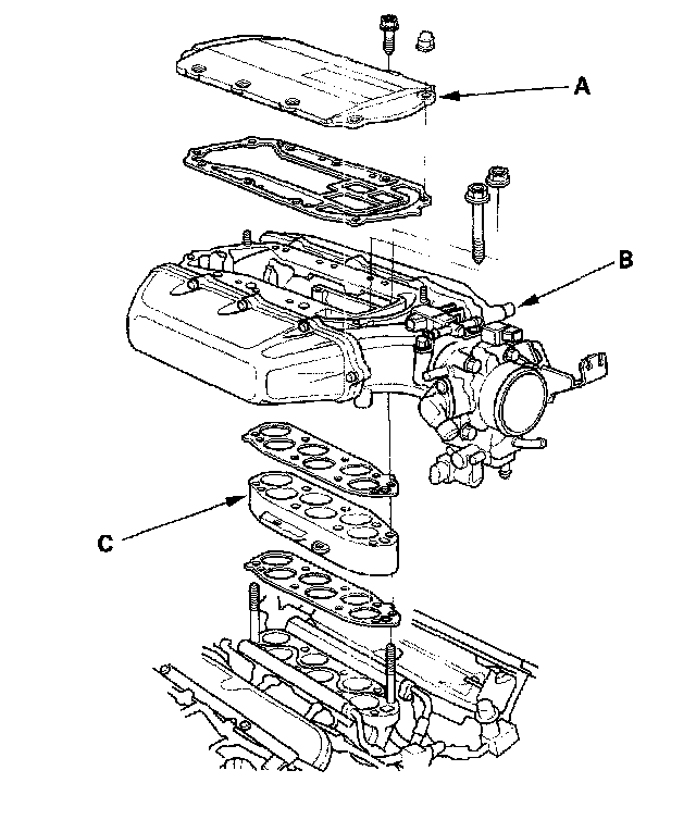 8. Remove the upper cover (A), then remove the intake manifold (B) and spacer (C).