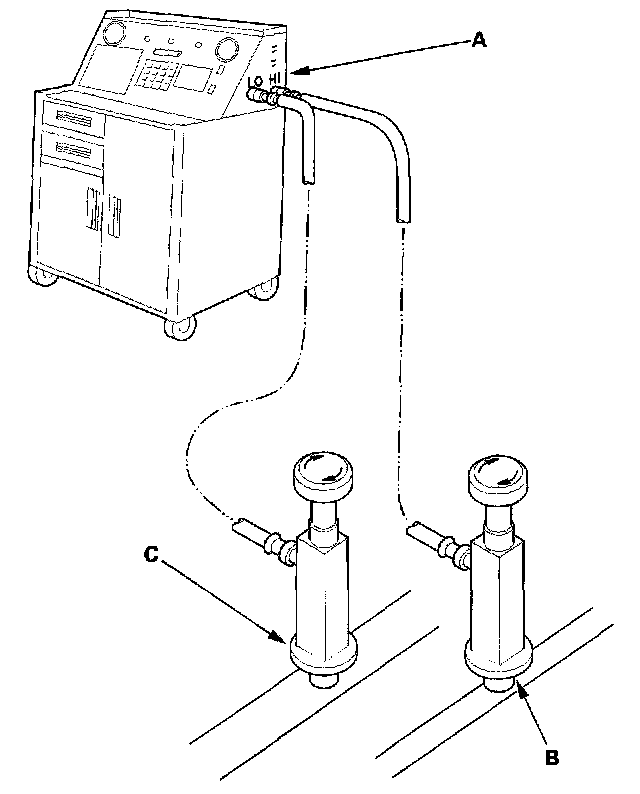2. Connect a R-134a refrigerant recovery/recycling/charging station (A) to the high-pressure service port (B) and the low-pressure service port (C), as shown, following the equipment manufacturer's instructions. Evacuate the system.