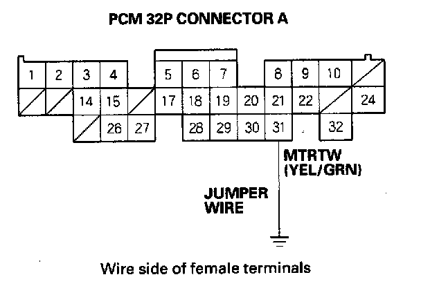 2. Turn the ignition switch OFF, and connect PCM 32P connector A No. 31 terminal to body ground with a jumper wire.