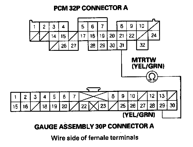 5. Check for continuity between PCM 32P connector A No. 31 terminal and gauge assembly 30P connector A No. 29 terminal.