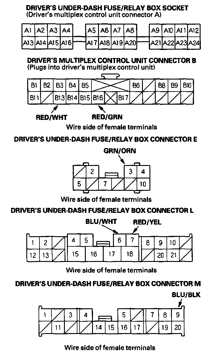 5. Reconnect the driver's multiplex control unit to the driver's under-dash fuse/relay box, and perform the given input tests at the appropriate connectors on the driver's under-dash fuse/relay box.