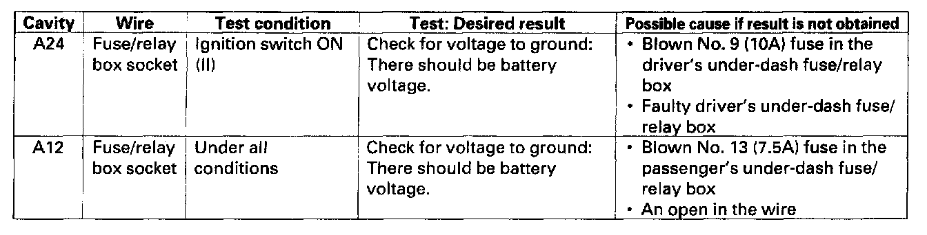4. With the driver's multiplex control unit still disconnected, make these input tests at the connector or driver's under-dash fuse/relay box socket.