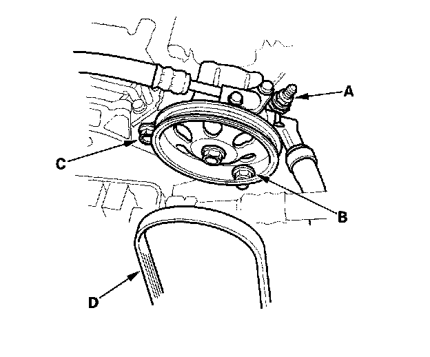 6. Loosen the adjusting nut (A), locknut (B) and mounting bolt (C), then remove the power steering (P/S) pump belt (D).