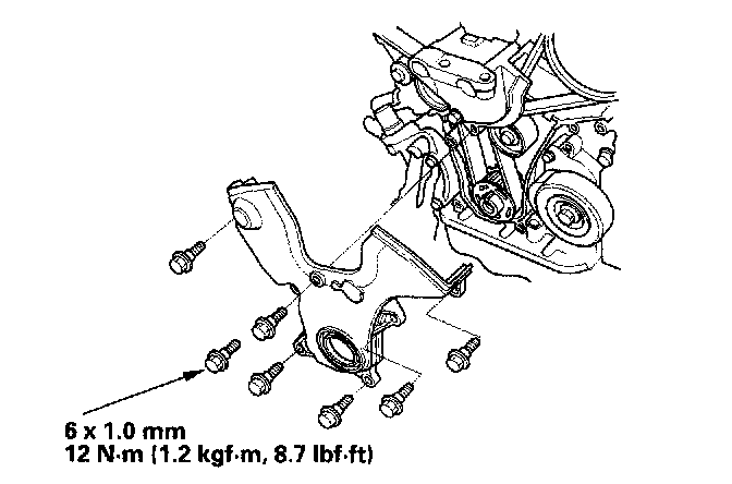 2. Set the timing belt drive pulley to TDC by aligning the TDC mark (A) on the tooth of the timing belt drive pulley with the pointer (B) on the oil pump.