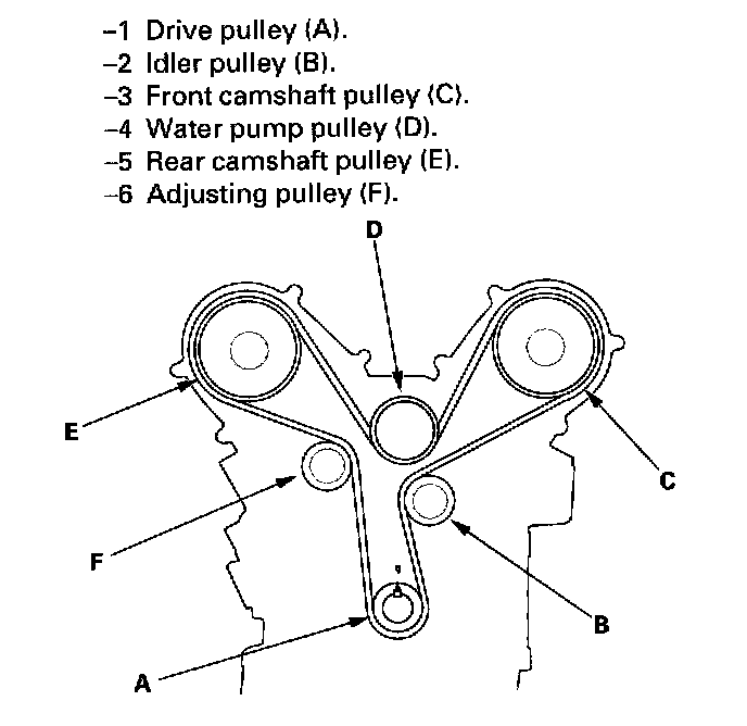 5. Install the timing belt in a counterclockwise sequence starting with the drive pulley. Take care not to damage the timing belt when installing it.
