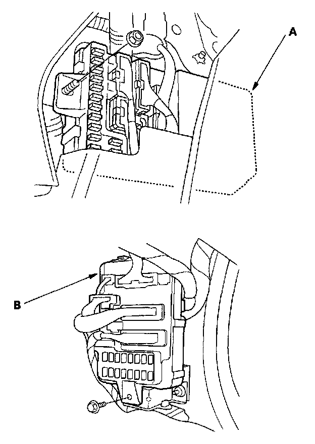 4. Remove the mounting nut or bolt, and pull the driver's under-dash fuse/relay box (A) or passenger's under-dash fuse/relay box (B) away from the body.