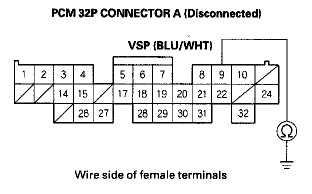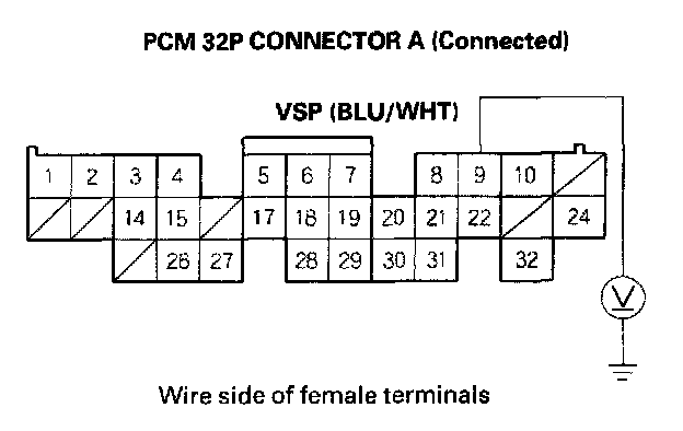 6. Connect PCM 32P connector A No. 9 terminal to the positive probe of a voltmeter, and connect the negative probe to body ground.