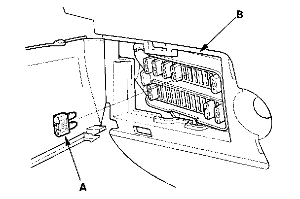 - Turn the ignition switch OFF, and remove the No.13 CLOCK BACKUP (7.5 A) fuse (A) from the passenger's under-dash fuse/relay box (B) for 10 seconds.