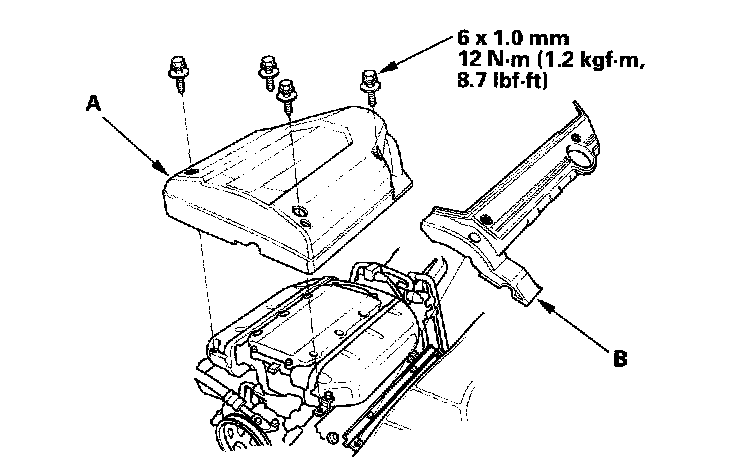3. Remove the intake manifold cover (A) and ignition coil cover (B).