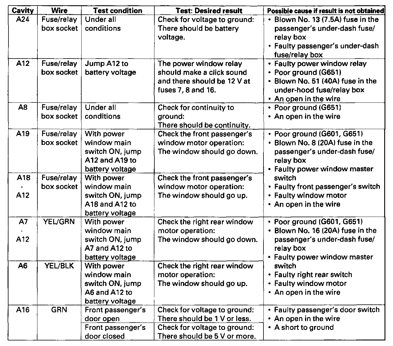 9. Remove the passenger's multiplex control unit from the passenger's under-dash fuse/relay box and connect fuse/relay box socket terminal A12 to battery voltage. This turns the power window relay on.