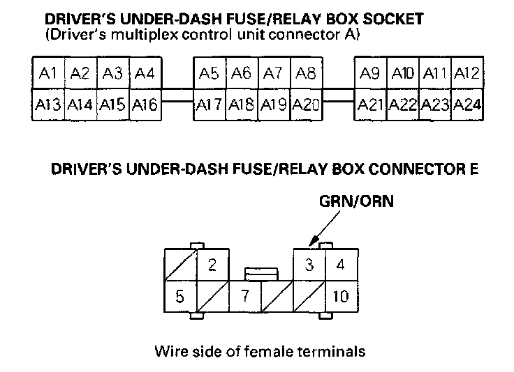 4. With the passenger's multiplex control unit still disconnected, make these input tests at the passenger's under-dash fuse/relay box socket.