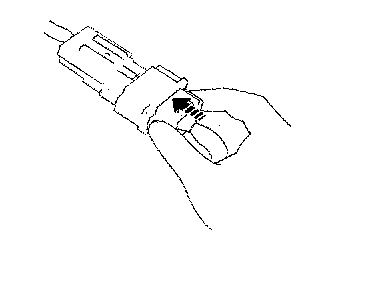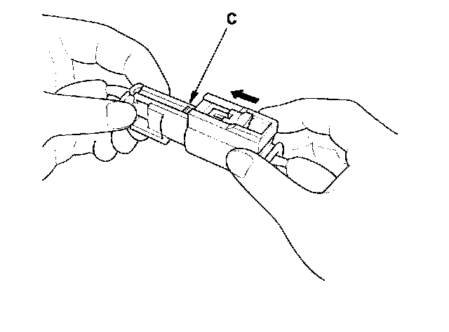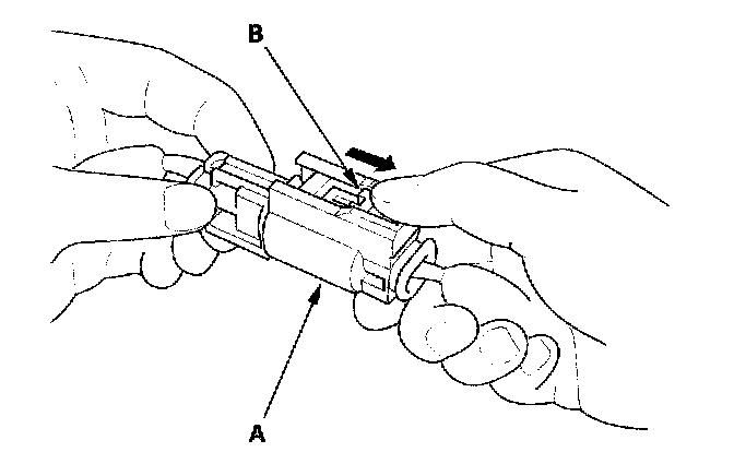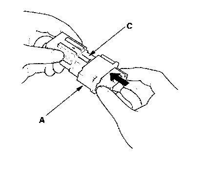 1. To reconnect, hold the pawl-side connector, and press on the back of the sleeve-side connector in the direction shown. As the two connector halves are pressed together, the sleeve (A) is pushed back by the pawl (C). Do not touch the sleeve.