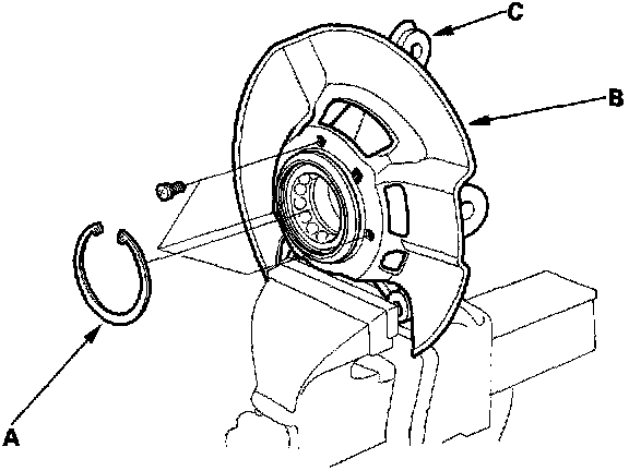 18. Remove the snap ring (A) and the splash guard (B) from the knuckle (C).