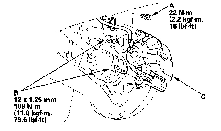 4. Remove the caliper mounting bolts (B), and hang the caliper assembly (C) to one side. To prevent damage to the caliper assembly or brake hose, use a short piece of wire to hang the caliper from the undercarriage.
