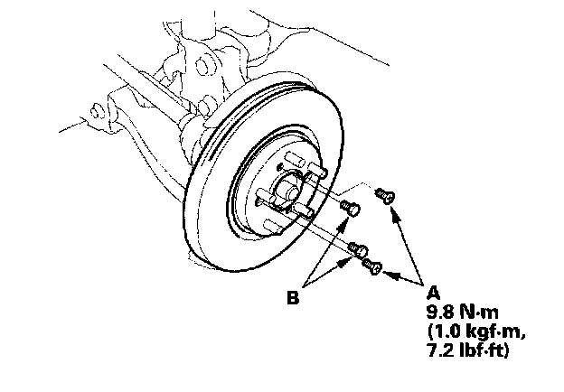 8. Screw two 8 x 1.25 mm bolts (B) into the brake disc to push it away from the hub. Turn each bolt two turns at a time to prevent cocking the disc excessively.