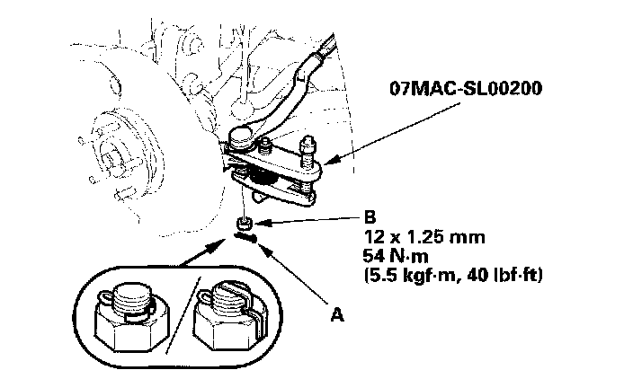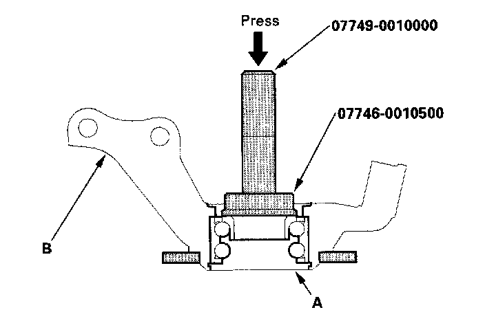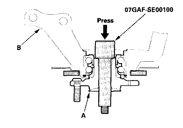 17. Separate the hub (A) from the knuckle (B) using the special tool and a hydraulic press. Be careful not to deform the splash guard. Hold onto the hub to keep it from falling when pressed clear.