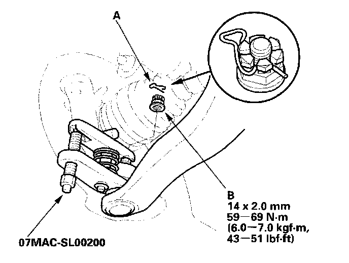 13. Remove the lock pin (A) from the lower arm ball joint castle nut (B), and remove the nut.