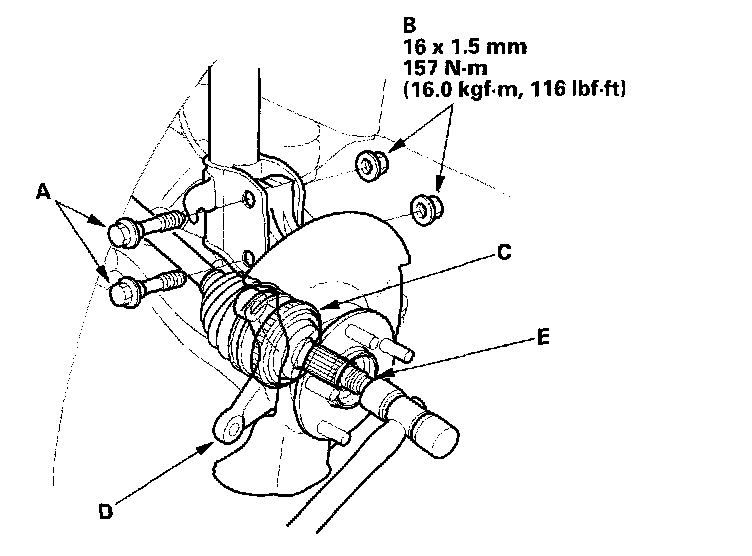 16. Pull the knuckle outward, and remove the driveshaft outboard joint (C) from the knuckle (D) by tapping the driveshaft end (E) with a plastic hammer, then remove the knuckle.
