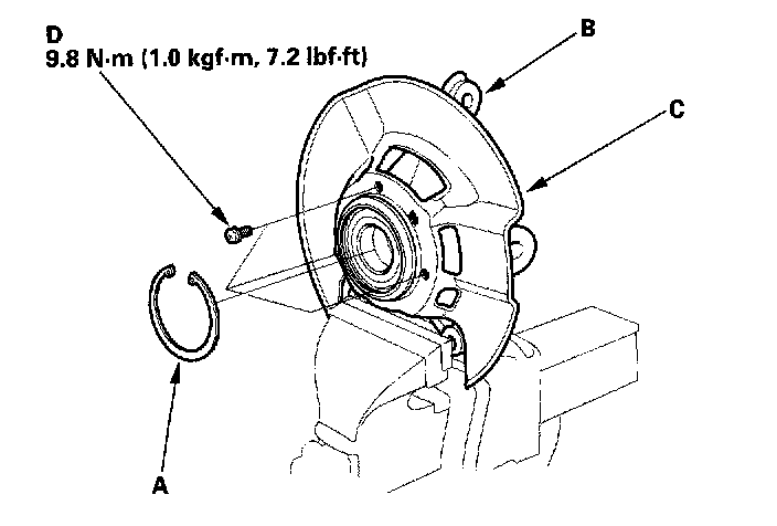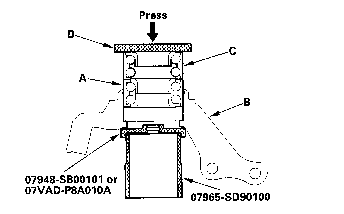 22. Press a new wheel bearing (A) into the knuckle (B) using the old bearing (C), a steel plate (D), the special tool, and a press. Be careful not to damage the sleeve of the pack seal.