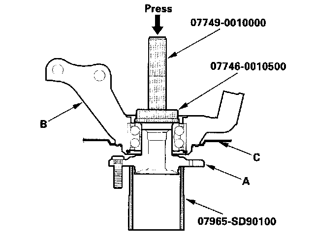 25. Install the hub (A) onto the knuckle (B) using the special tools and a press. Be careful not to deform the splash guard (C).