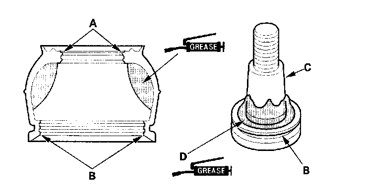 3. Wipe the grease off the tapered section (C) of the pin, and pack fresh grease into the base (D). Do not let dirt or other foreign materials get into the boot.